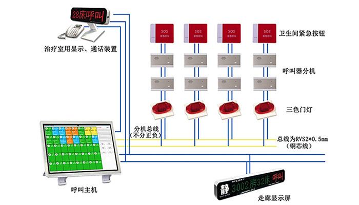 醫(yī)院呼叫對(duì)講系統(tǒng)主要由護(hù)士站系統(tǒng)主機(jī)連接病房床頭呼叫器分機(jī)組 成,實(shí)現(xiàn)護(hù)士與病員之間的通訊功能。