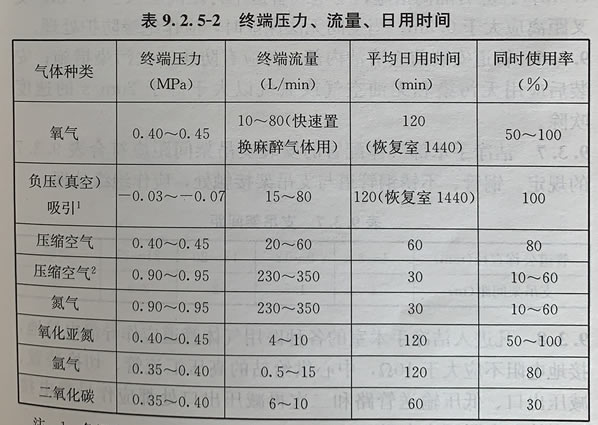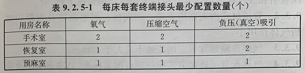 5、每類(lèi)終端接頭配置數(shù)量應(yīng)按表9.2.5-1確定。手術(shù)室醫(yī)用氣體終端壓力流量、日用時(shí)間應(yīng)按表9.2.5-2確定。
